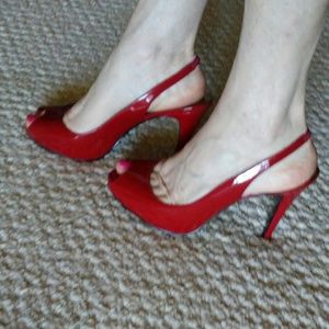 So Pretty/Super Sexy!!!.. Candy Apple Red Patent with a Gold Foot bed... Peep toe/sling back with elastic for comfort. These are New never been worn, there are a few marks on the gold lined foot bed does not take from this beautiful shoe, see pix 3 &7. Heel is 4-1/2 inches, with a hidden Platform of just over 1/2 inch. I do not have the box. If your searching for a certain color shoe just ask me... I have a closet full.... Love my heels!!!