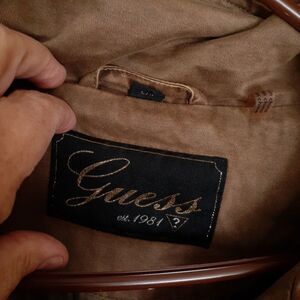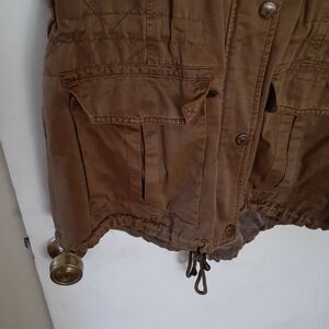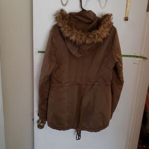 Guess tan brown utility anorak fall winter coat jacket l large cotton this jacket is in excellent condition. the fur on the hood is removable. it has great detailing.casual look