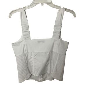 Corset white sleeveless top with a square neckline. Features a stylish hook and eye front design.
