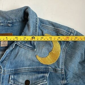 Guess raw hem 3/4 sleeve cropped blue jean jean jacket. Two pockets. Snap closure. Hippie. Patches of stars and cactus, peace sign, moon