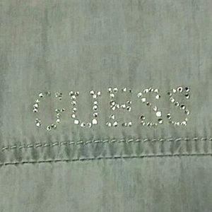 Girls light blue button down denim dress is layered at the bottom with a cream colored ruffle, has long sleeves that button in place when folded, "Guess" is spelled out in silver below the back collar and has a light brown belt to pull it all together. Only worn a couple times so it is in GREAT condition. However, a few sliver stones came did off in the wash but can't be seen if hair isn't pulled up.