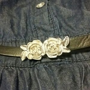 Girls dark blue denim dress in EUC! So cute with all the bottom layers of ruffles and adjustable back belt with silver roses buckle.