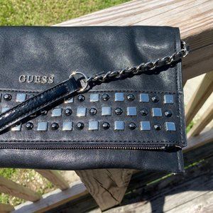 This bag is a classic piece with a little edgy flair with the black & silver studs. There are multiple pockets in this purse, several on the inside & one the top secured with a zipper. The envelope is secured with the two magnetic snaps. The timeless classic has a optional chain and leather strap