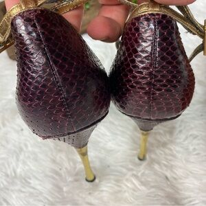 Guess gold colored maroon snakeskin buckle open toe stilettos heels 8