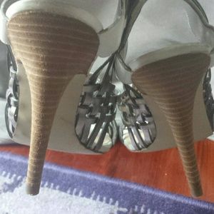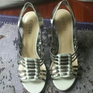 Super cute guess heels. Only worn twice. They've been sitting in my close and I just don't wear them enough. They are white and silver, but not a day glow white. They have a 4" heel.