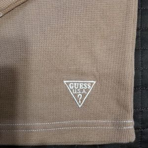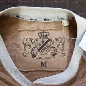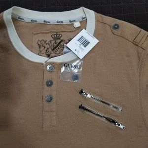 NWT Guess Jeans henley shirt. 3 button long sleeve waffle knit.. color ginger brown. super soft. Stylish zippers on front shirt, as well as button shoulder straps. logo near bottom hem. size medium.