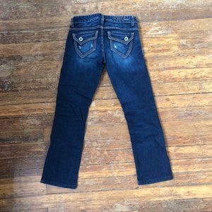 Low rise, straight leg, deep blue color with slight distressing. These jeans have been hemmed to an inseam of 26.25". True color is in photos 1, 3, 7 and 8. In great condition!