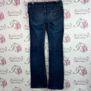 Stylish dark blue boot cut jeans by Guess. Perfect for versatile wear. 25.