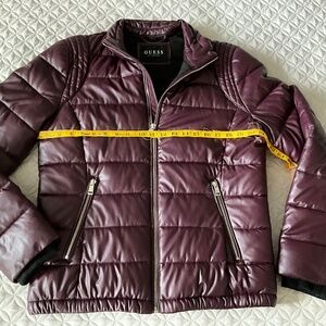 Guess stylish ladies jacket. Gently worn, gorgeous condition. Burgundy color. Outside zipper pockets and two inside pockets. Measurements in the photos. Size large, but runs a bit smaller. Looks like a puffer jacket, but is not as soft. Fabric has more structure.