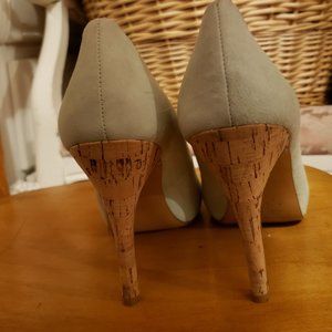 Guess light green suede-like peep toe heels with cork-covered heels Condition: good (some peeling, no odor)