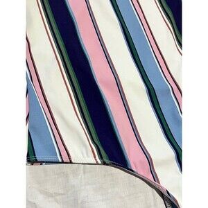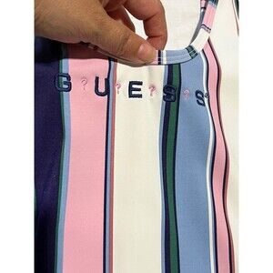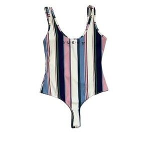 Guess logo Women's striped White/Pink scoop back thong Bodysuit snap closure EUC
