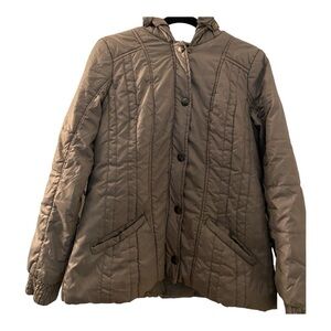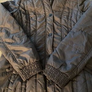 Guess puffer coat, with hood, size Large. Zipper and snap closure.