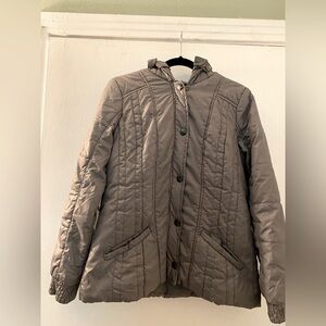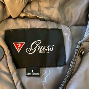 Guess jacket, a nice gray color. The hood can be buttoned up if not needed. This style jacket was designed to be more than of a snug fit for warmth. Please check measurements.