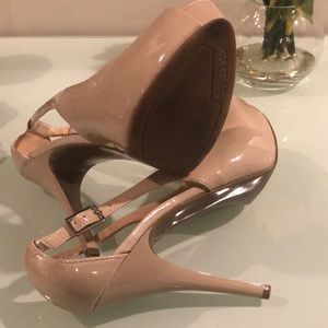 Beautiful Guess pumps in nude/tan. Gently used. No damage to heels. Lovely and comfortable open toe pump.