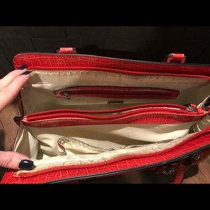 Red Guess purse. 2 large compartments, big center zipper and side zipper pockets. 3 pockets on the other side. Nice place for cell phone. The purse has a main zipper to close for security. Some wear and tear on handles.
