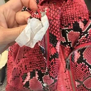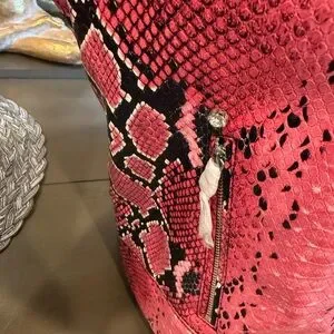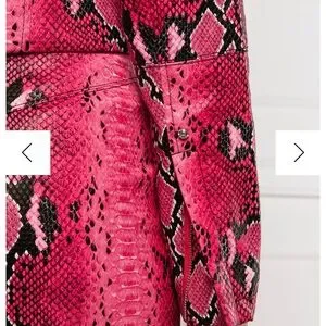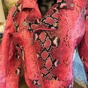 Elevate your style with this striking Guess leather jacket, featuring a bold pink snakeskin print. Crafted in a classic motorcycle silhouette, it boasts a glossy finish and fitted design. This statement piece is perfect for adding an edgy touch to any ensemble.
