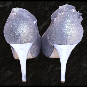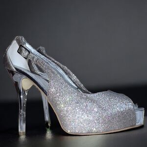 Features: rainbow glitter on a silver body, silver heels, peep-toe