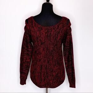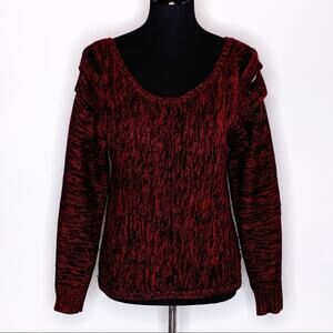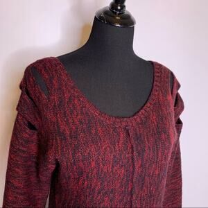 Guess red and black marled sweater with cutout sleeves. Pullover style with scoop neckline. Long sleeves with cutouts at shoulders. Ribbed sleeve cuffs and hemline. Size M. Excellent preowned conditon. Minor fuzzing from wool. Acrylic wool blend.