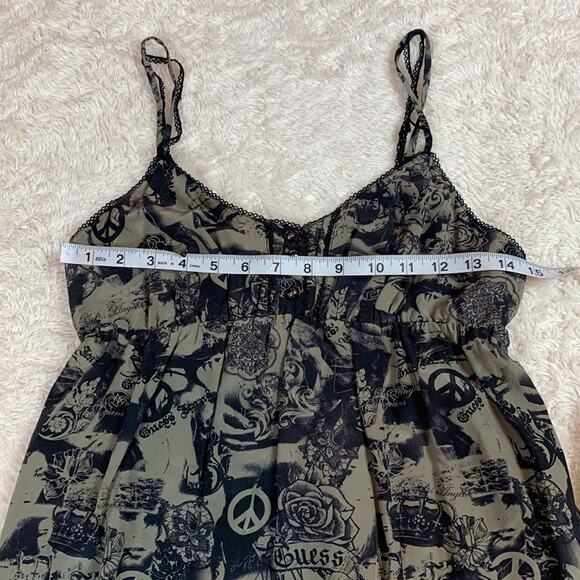 Sweet roses and peace sign graphic print mini sundress by Guess. Features smocked or shirred back, jewel style buttons, empire waist and adjustable spaghetti straps.