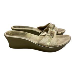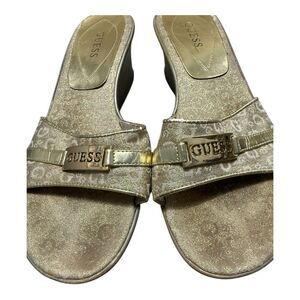 Guess wedges size 7.5 gold well worn. Zoom in to see all wear & tear. Smoke free dog friendly home