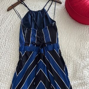 GUESS Satin blue, black, white pattern maxi dress. halter neck with criss cross lace up back. Only worn 1 time in Excellent condition. Size 0. Pair with Marciano heels from my closet! Smoke free home. See my closet for more dress!