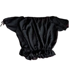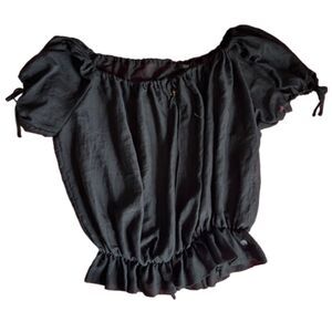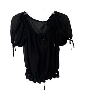 Guess black semi sheer top, with gathered waist , puffy short sleeves , tie neckline , lightweight, great summer boho , festival piece