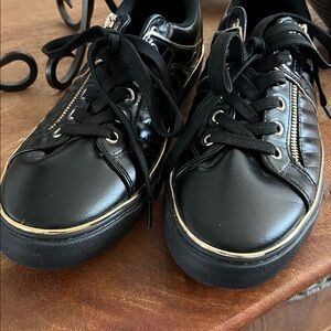 Gorgeous Guess shoes. Gently worn. Stylish and comfortable. Gold tone trim and gold zipper accents.
