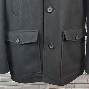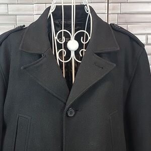 A wool blend single breasted peacoat by Guess with a notched collar 4 front pockets, epaulets, a walking vent, and fully quilted lined with some insulation for warmth. Good pre-owned condition with normal signs of wear, including some piling. See pictures.