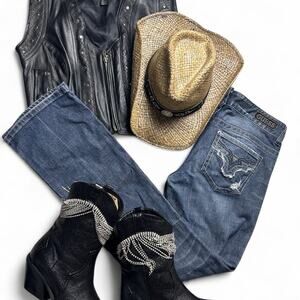 Howdy! Get ready to ride in style with these fantastic Guess Western Bootcut Jeans! These jeans are in excellent condition and ready for a new home. The classic bootcut design is perfect for pairing with your favorite boots, adding a touch of western flair to any outfit.