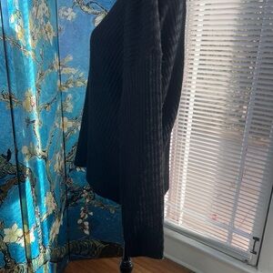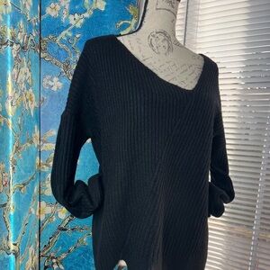This Guess, slouchy, sz L, black sweater with an asymmetrical design, can be glam up or is perfect with a pair of jeans with a belt or untucked! Super comfy! Only worn a couple times. Polyester acrylic blend.