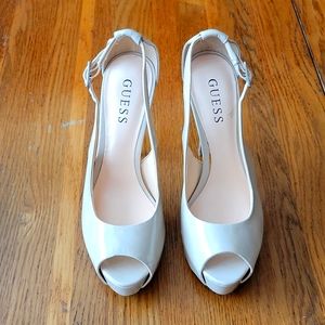 Guess sz 6 nude patent leather platform heels. 1"platform, 4" heel. Good used condition, cleaned, but stored for a while. Light wear on heels. (See pictures) Simple and easy to style.