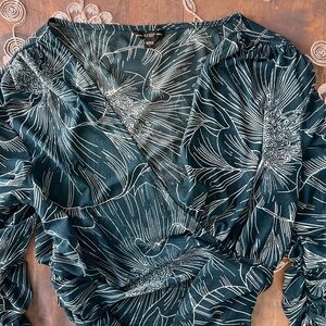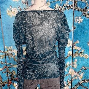 Guess sz L, green floral blouse with Ruching on the sides and the sleeves.