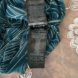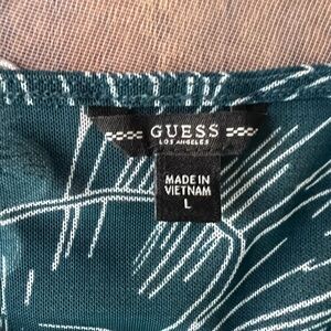 This sheer, green and white floral Guess sz L, blouse can be dressed up or down. It has ruching on both the sides and the sleeves to give it just the right touch of elegance and also fit many shapes and sizes!