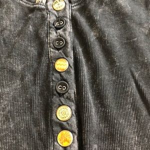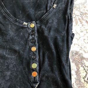 Black tie dyed tee with designs on buttons