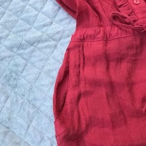 Burnt orange in color tank top. Gently used. Has front pockets. Tie in the front does adjust and can tighten or loosen to your desire. Is a longer tank top so the pockets are more waist height.