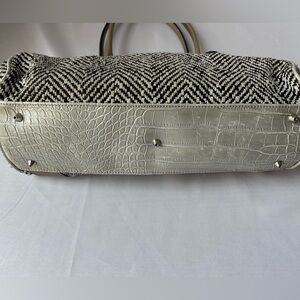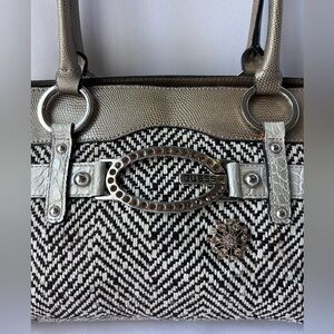 This stunning GUESS handbag is the perfect accessory for any fashion-forward individual. Crafted with a luxurious tweed fabric in a classic black and white herringbone pattern, this satchel exudes sophistication. The silver-tone hardware, including the iconic GUESS logo plaque and decorative buckles, adds a touch of glamour. The bag also features a unique reptile-embossed trim and a charming charm for added detail.