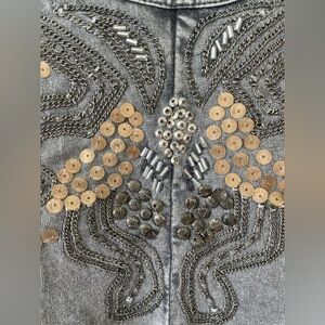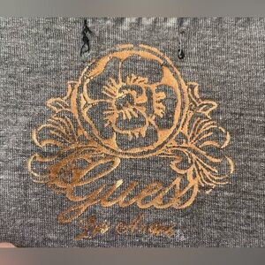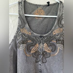 Guess vintage oversized tank top, tan embroidered design, handkerchief hem; XS