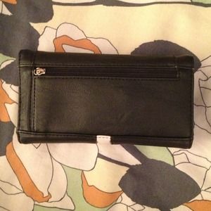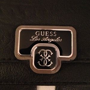 Black guess wallet with a white stripe. The wallet snaps closed and has plenty of space for your cards and money. On the back of the wallet there is a coin compartment. The handle for the zipper is no longer there but it opens and closes just fine still.