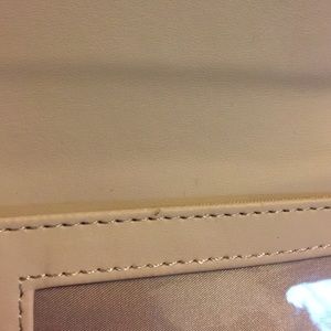 Medium sized wallet. 3 cash slots and 12 card slots and on ID slot. One zipper pouch on the back. Only used one day! Super soft faux leather, I think. Some imprints from my debit cards on the inner flap and one tiny mark that was there when I bought it which is pictured.