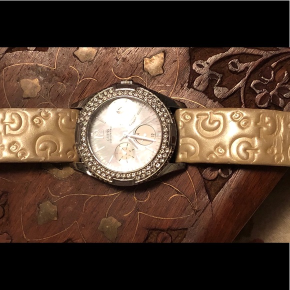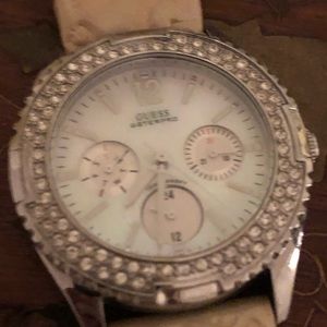 Pre-loved GUESS “bling-bling” and mother of pearl face ladies watch. Genuine white leather strap. Batteries not included.