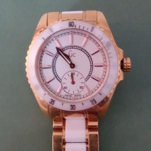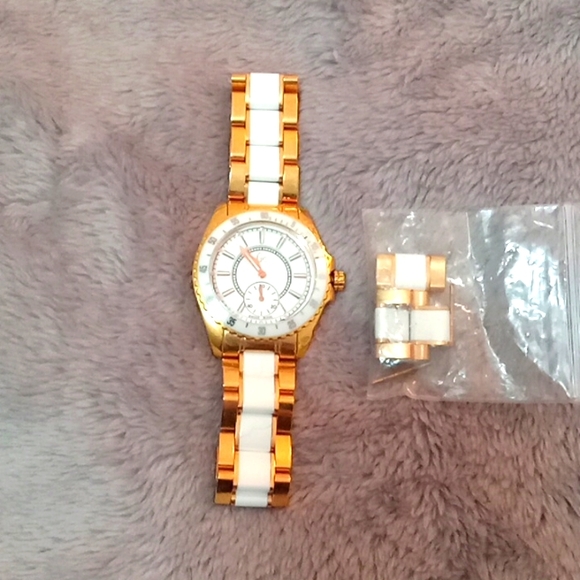 white enamel and rose gold plated watch by "Guess" with 3 extra links. fits sizes from 61/2 to 8 tiny Crack in 1 enameled link