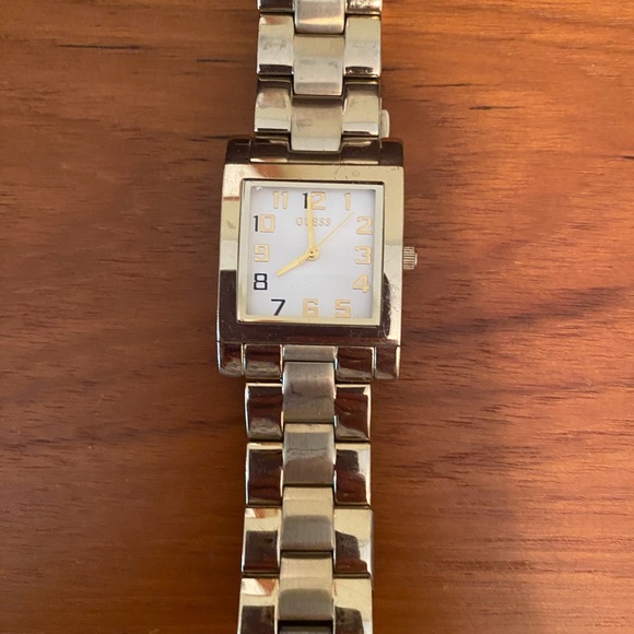 Guess watch - gold color - square white face. Needs battery