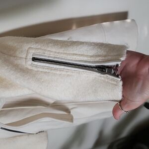 Guess wool blend long line midi length coat white off white women's size medium, tie belt at waist, boucle sleeves.
