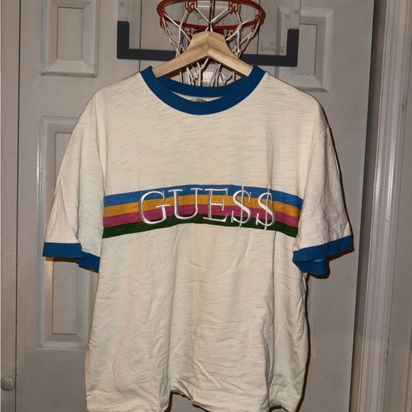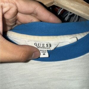 Classic Guess T-shirt with a blue collar. Soft white fabric. Comfortable fit.