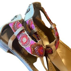 Guess 7 Pink Tan Beaded Embellished T-Strap Flip Flop Sandals Boho Festival