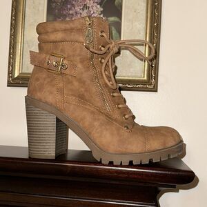 Guess 9.5 M Jaylee Light Brown Faux Leather Lace-up Side Zip Heeled Ankle Boots