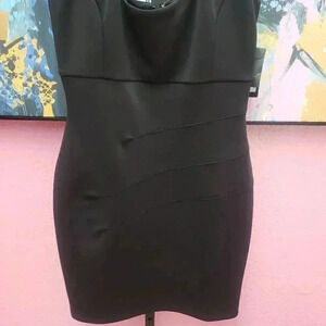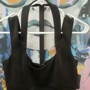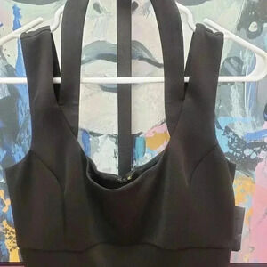 Form fitting, cutout neckline. Neck has 2 buttons with elastic, one of the elastic pcs is not attached on one side.