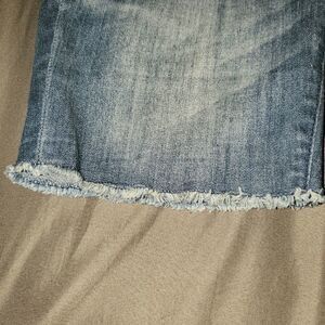 Medium wash denim shorts. Medium lenght. Distressed hem. Front and back pockets. Pre-owned in excellent condition.