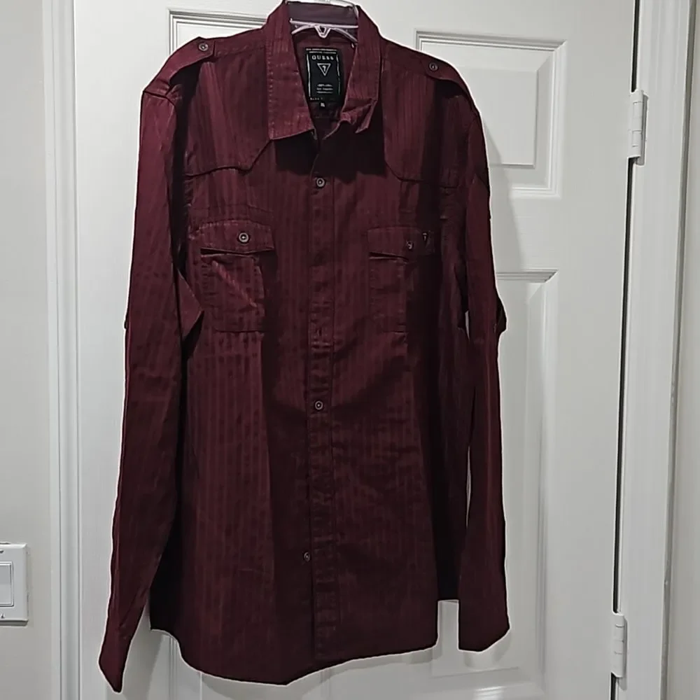 BNWT Guess button down. logo on sleeve, size XL. Burgundy color
