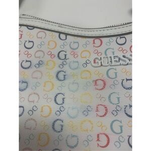 Ladies super cute white vegan leather multicolored monogrammed guess handbag. Has some fading of the colors and lettering as shown in the pics. Structure of the bag in like new condition.